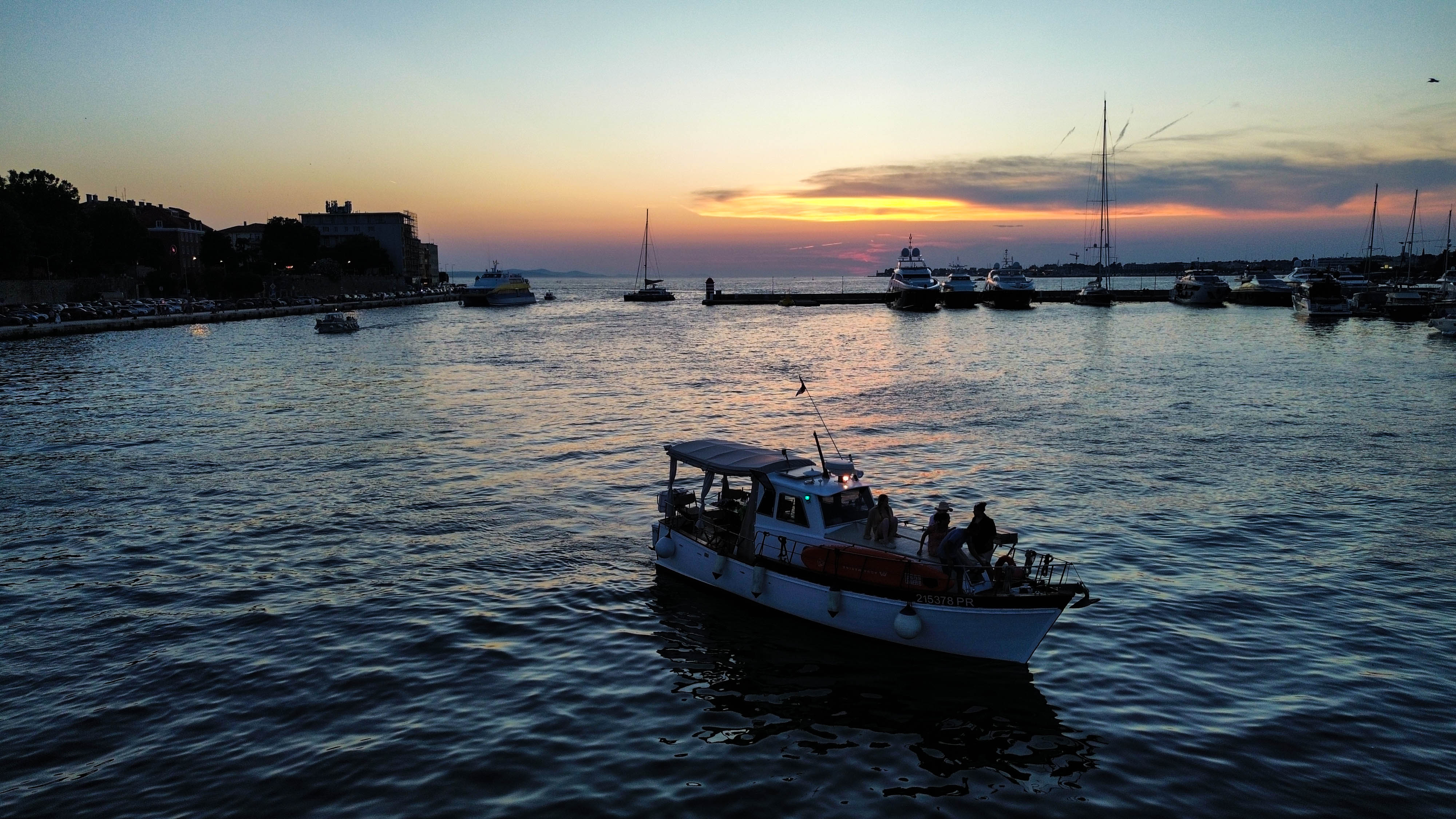 Prywatny rejs motorówką w blasku zachodzącego słońca to czas na wspólne uśmiechy i podziwianie panoramy Zadaru z perspektywy morza. Tylko Wy, szum fal i błękit zmieniający się w złoto.